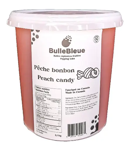 Apportez une touche sucrée et gourmande à vos boissons avec nos bulles à saveur de pêche bonbon, créées par Bulle Bleue. Leur goût doux et sucré rappelle les bonbons à la pêche, pour une expérience fruitée et irrésistible dans vos bubble tea, smoothies, cocktails ou desserts.